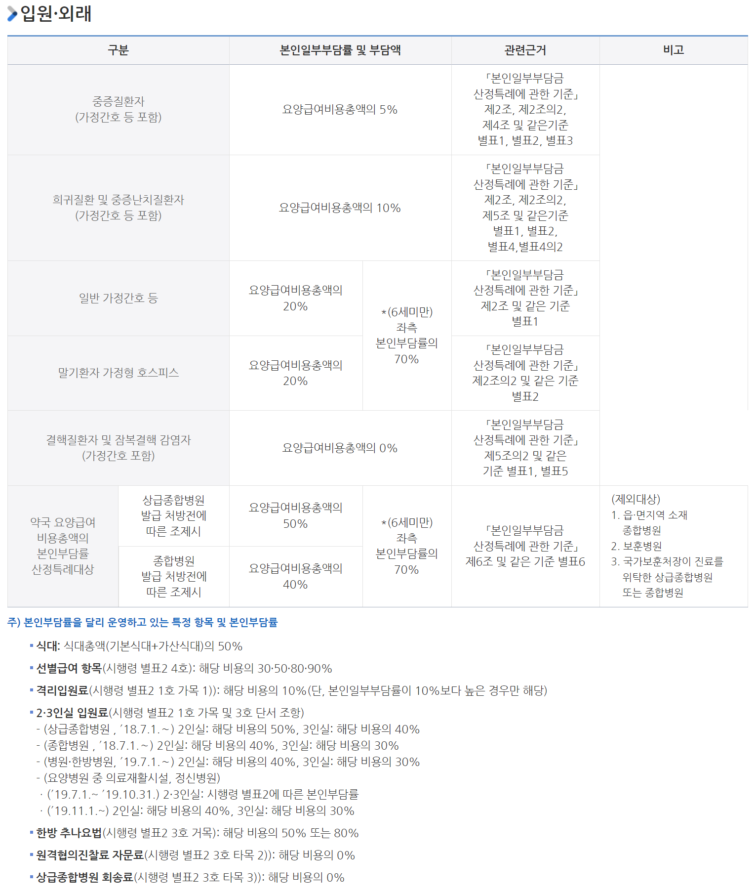 본인일부부담금 산정특례 제도(국민건강보험법 제44조, 동법 시행령 제19조 제1항 및 별표2)