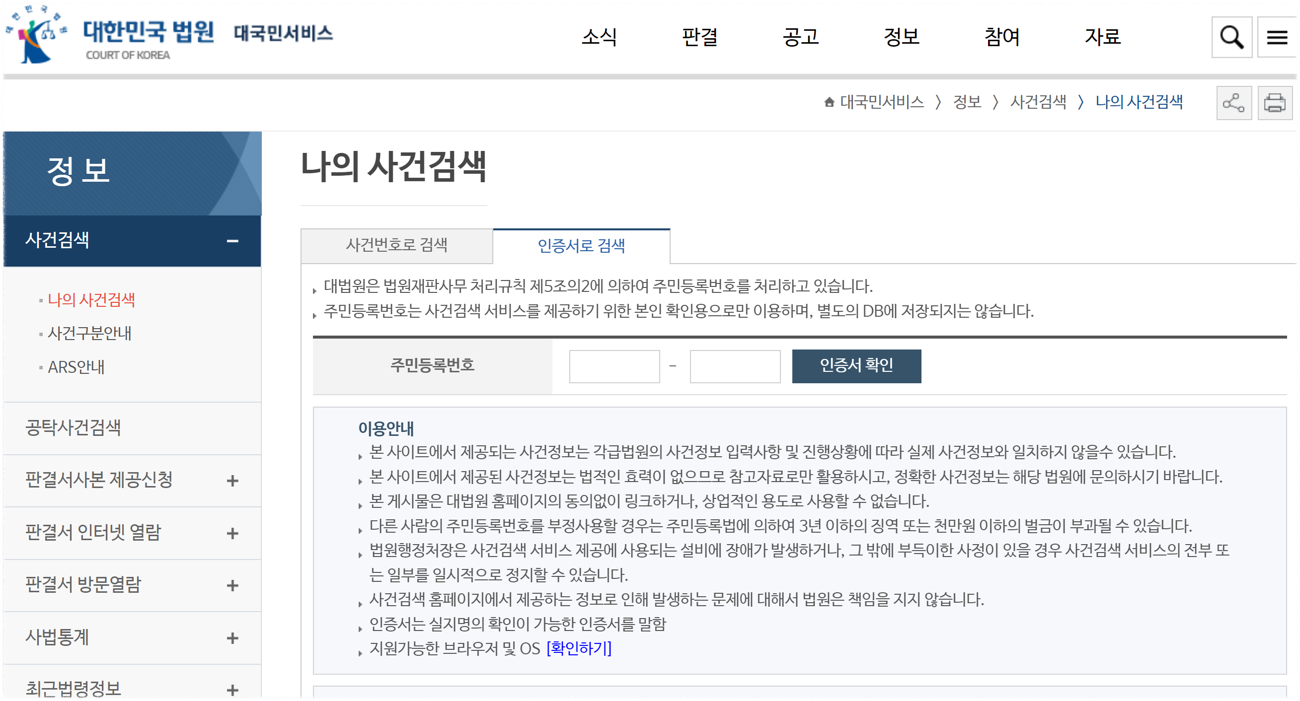 나의 사건 검색에서 인증서로 검색을 클릭해 주시고 주번호를 넣고 인증서로 검색해 주세요,