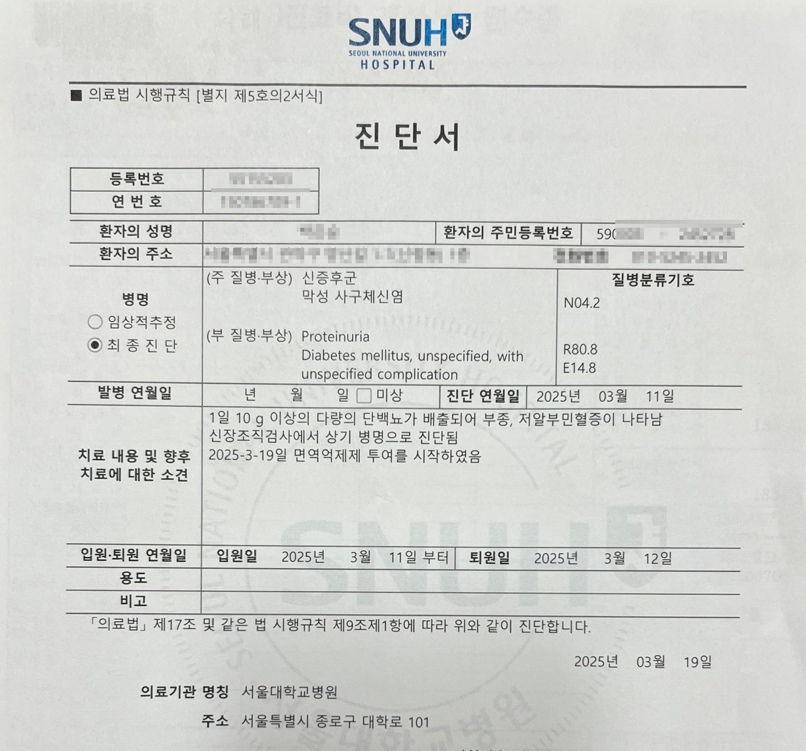 서울대병원에 입원해서 신장 조직검사까지 진행을 하고 나서야 막성 사구체신염(N04.2)를 확정 진단받았다.